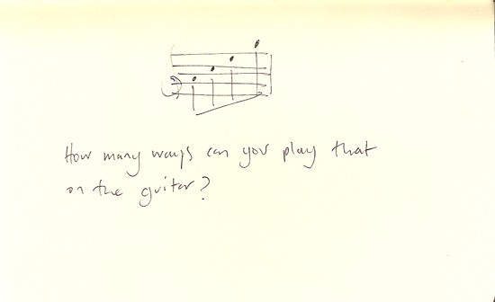 I can do it because I know the fretboard really well, and I know the sound and the name of the note I’m after. So I don’t have to learn patterns and shapes. I use these three bits of knowledge – the sound, the name, the fretboard location – to be able to fluidly move the material anywhere I want it.